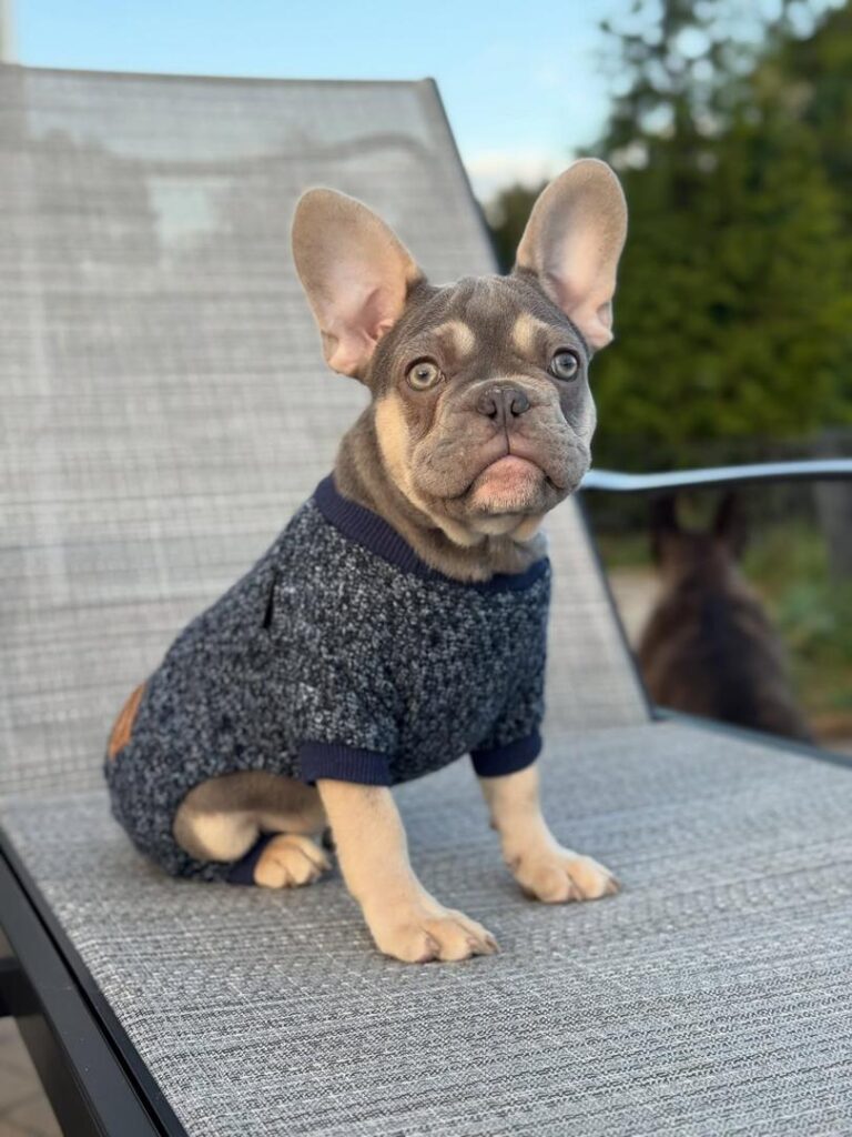 DESCRIPTION: Lilac Tan Merle Frenchie, charming, sweet, full of personality, and the total package. Vet-checked, healthy, and ready for a forever home.
